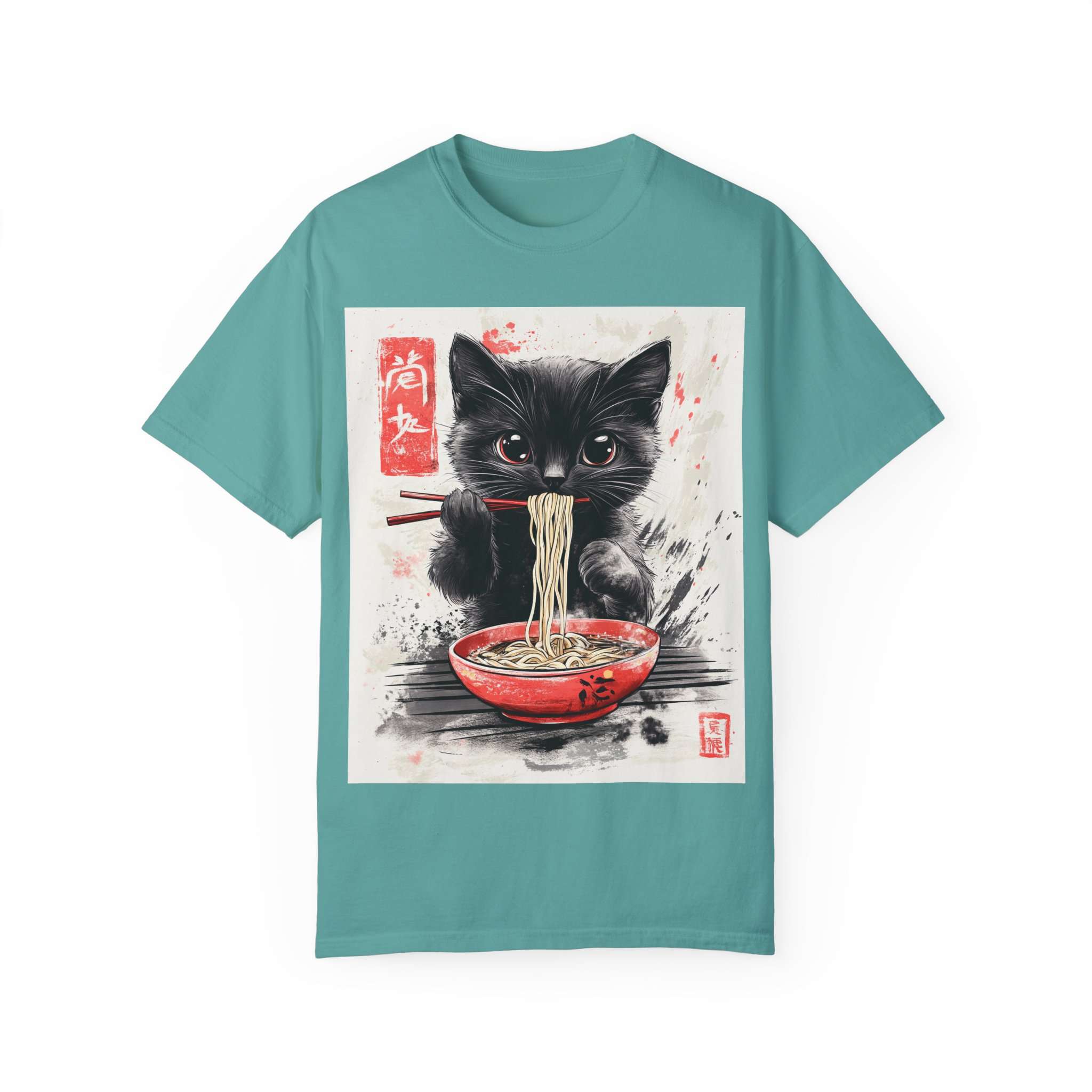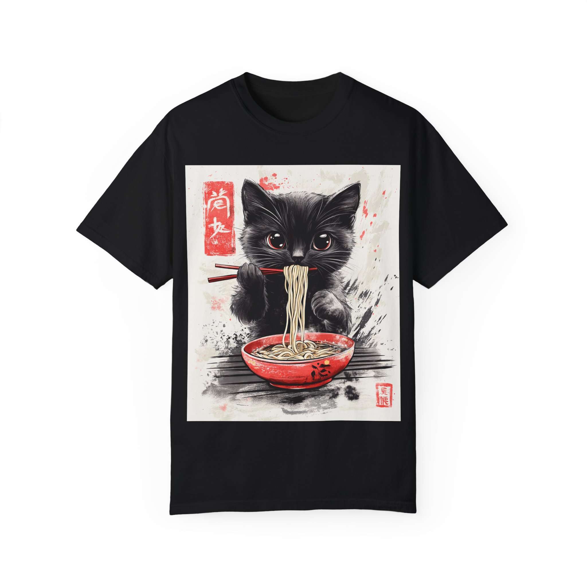 • Cat Ramen Design: An adorable and quirky graphic of a cat enjoying a bowl of ramen, perfect for cat lovers and food enthusiasts alike.