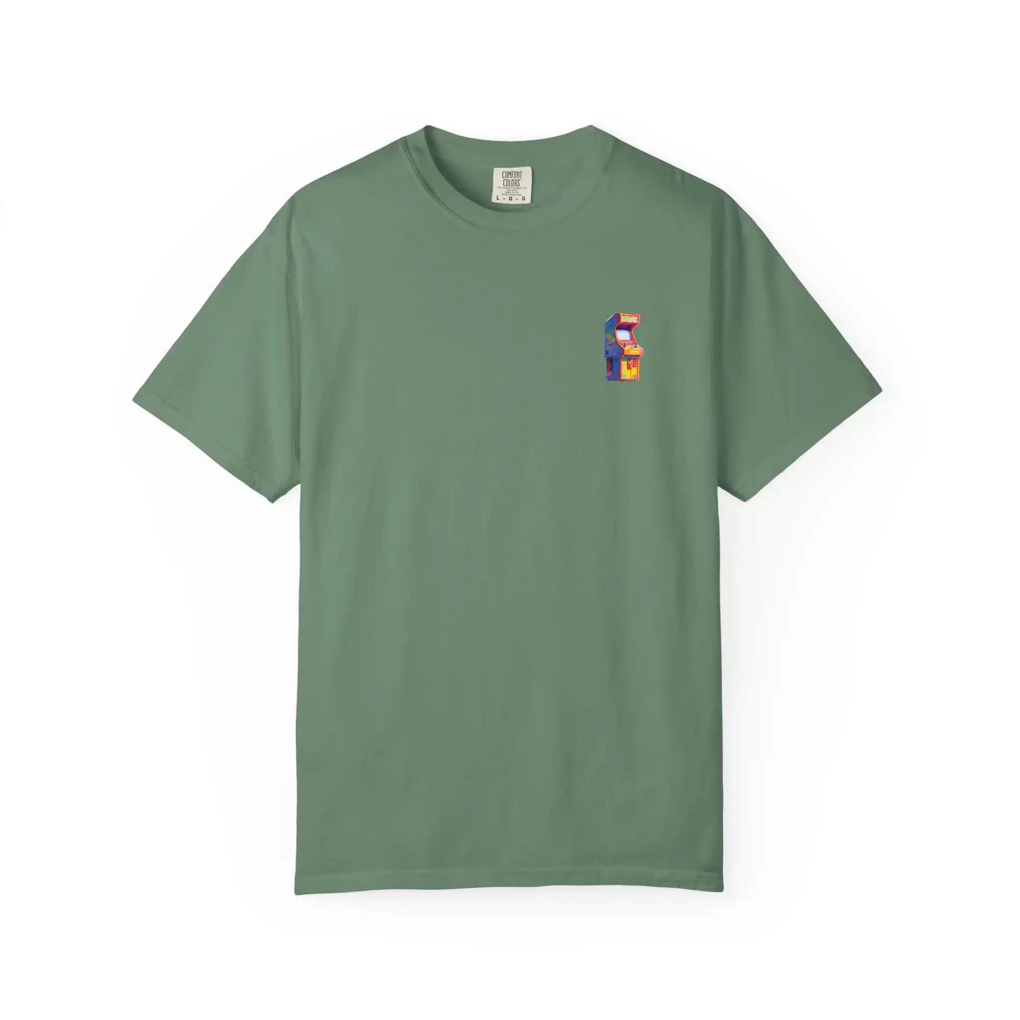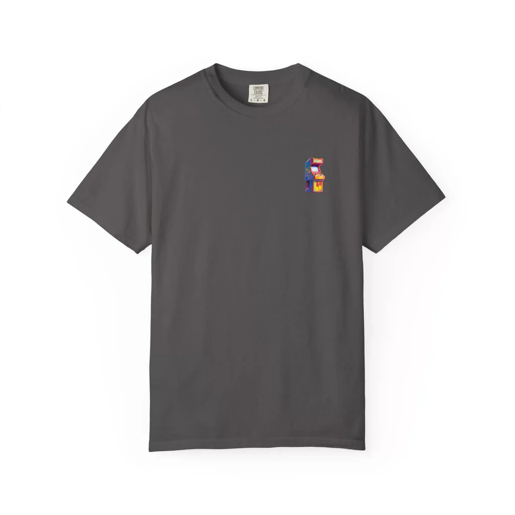 A minimalist retro classic arcade graphic shirt that gives off a vintage vibe. Perfect for casual wear or as a statement piece in semi-formal settings. Ideal for adults looking for a unique and nostalgic addition to their wardrobe. Relevant for retro gaming enthusiasts and fans of classic arcade games. Great for gifting during birthdays, holidays, and special occasions.