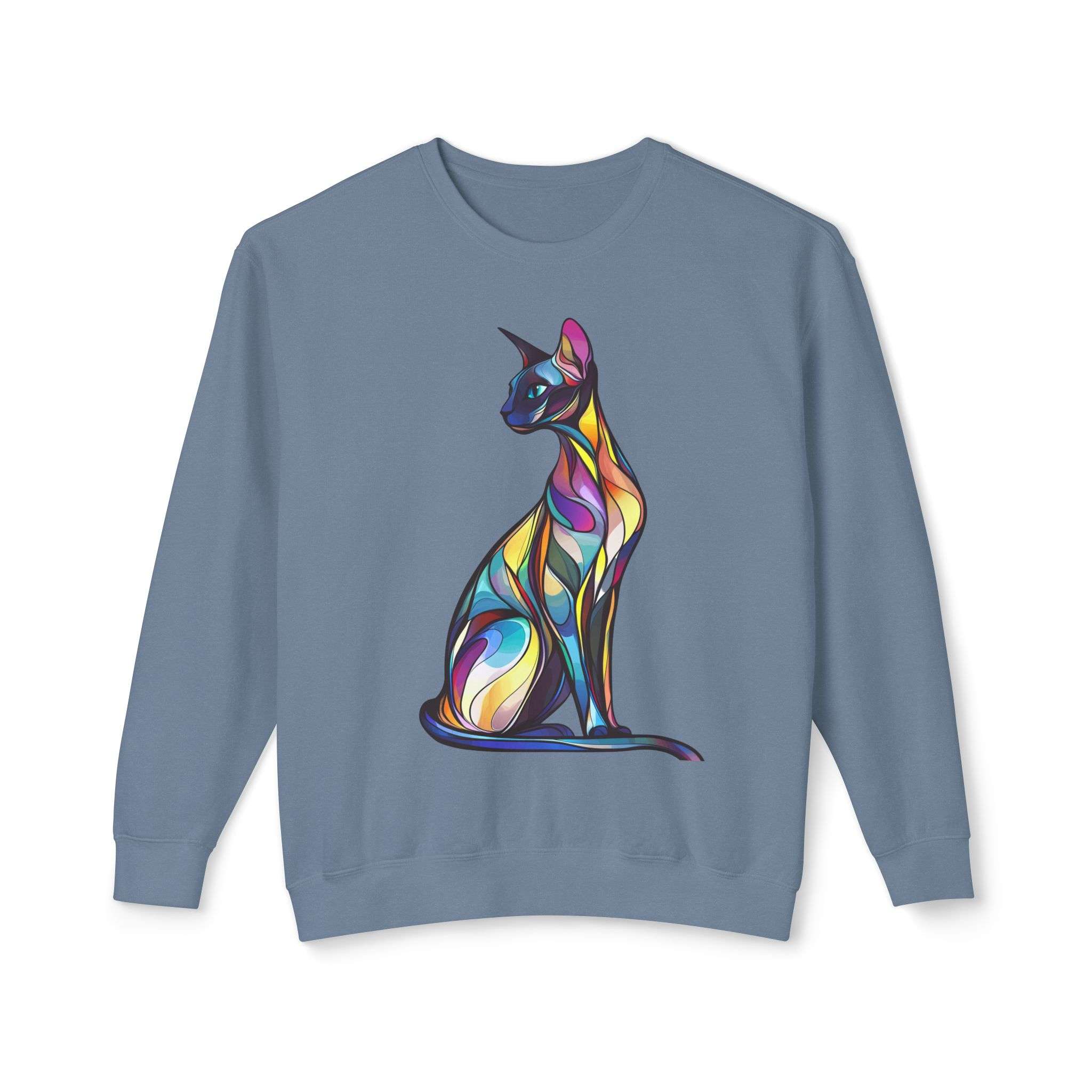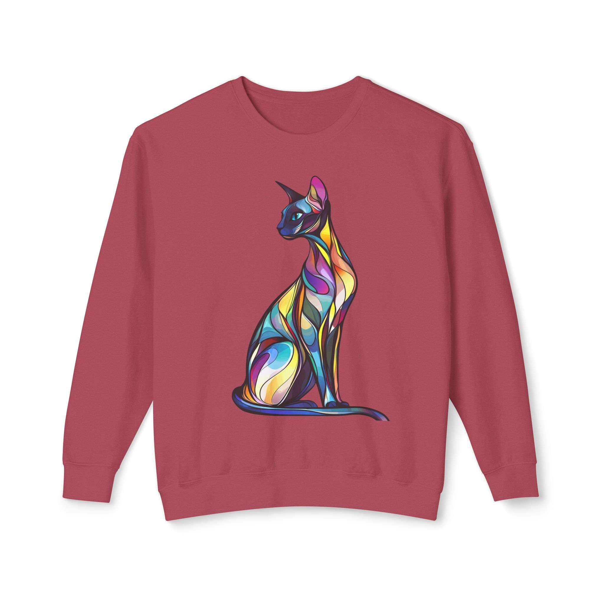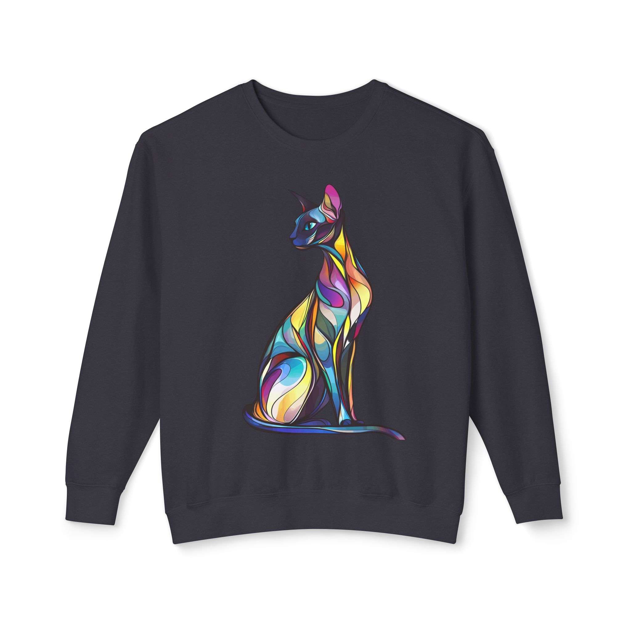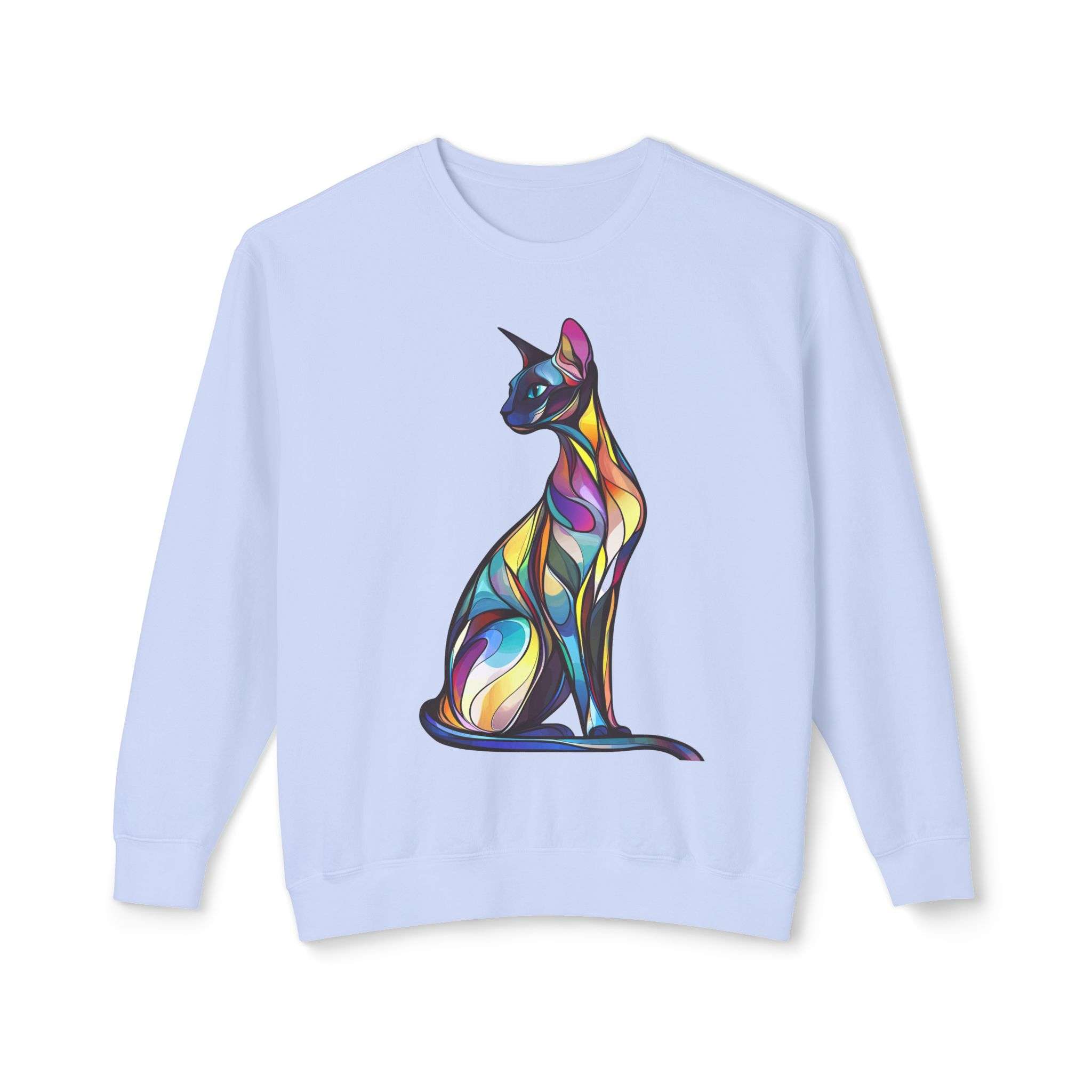 Colorful cat artistic sweatshirt perfect for cat lovers and those who enjoy vibrant designs. This sweatshirt gives off a fun and playful vibe, making it a great addition to a casual outfit. Ideal for wearing during the fall and winter seasons or as a cozy loungewear option.