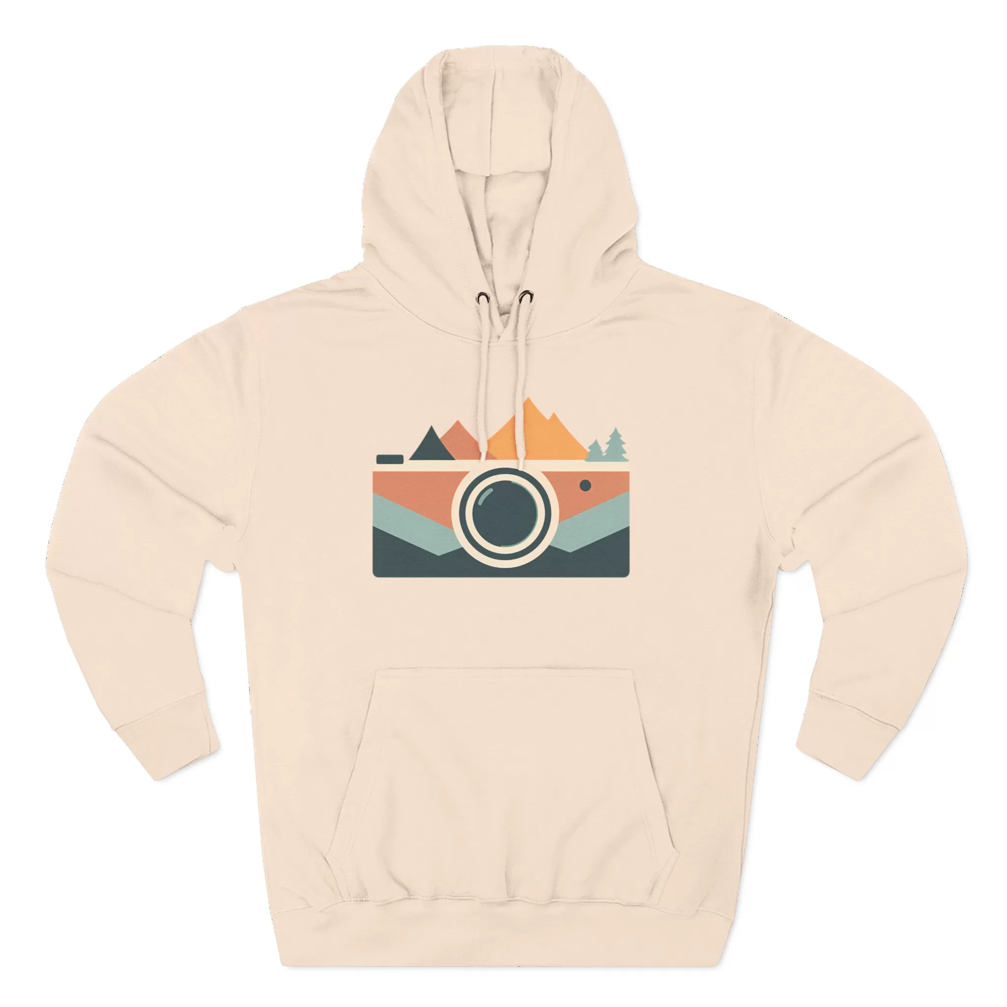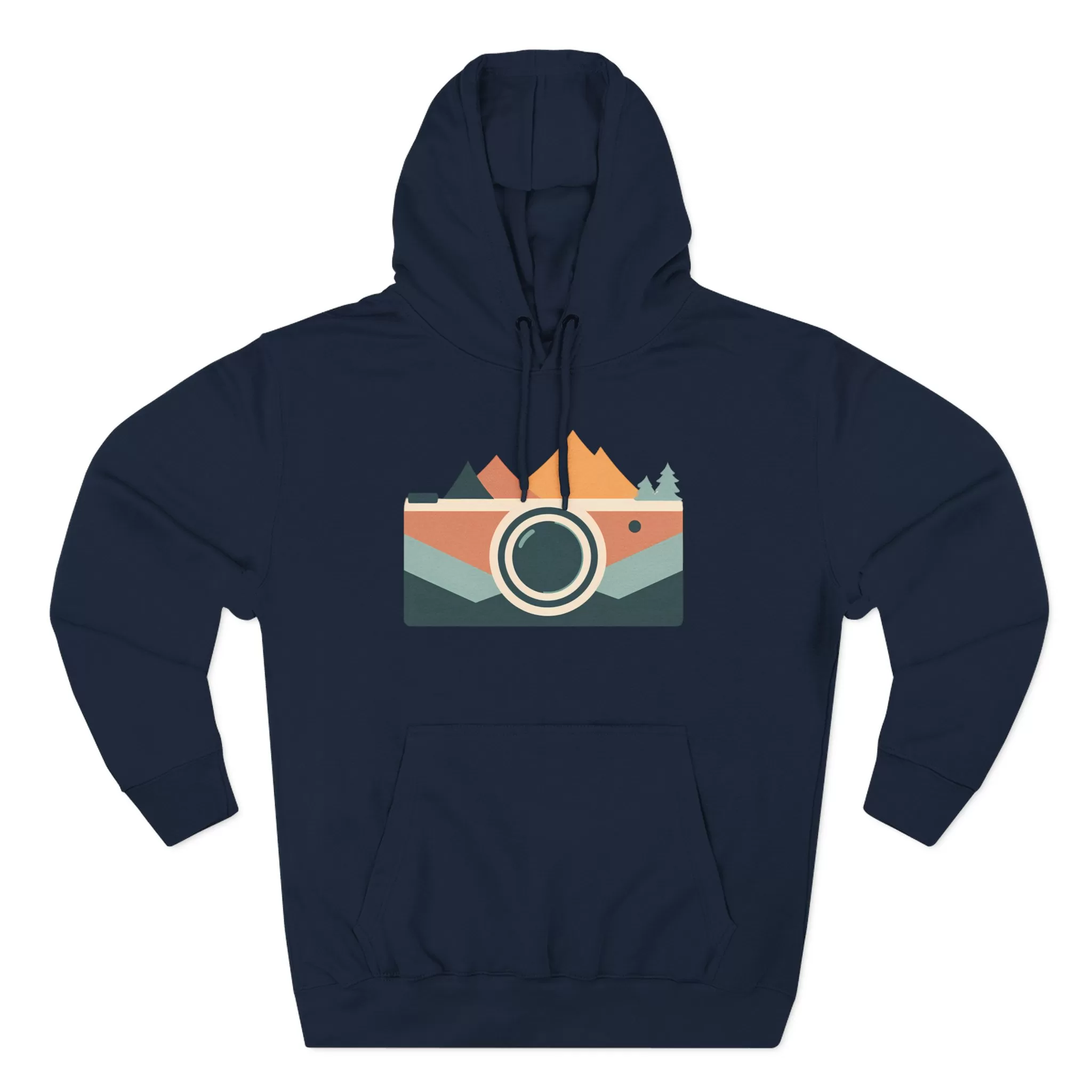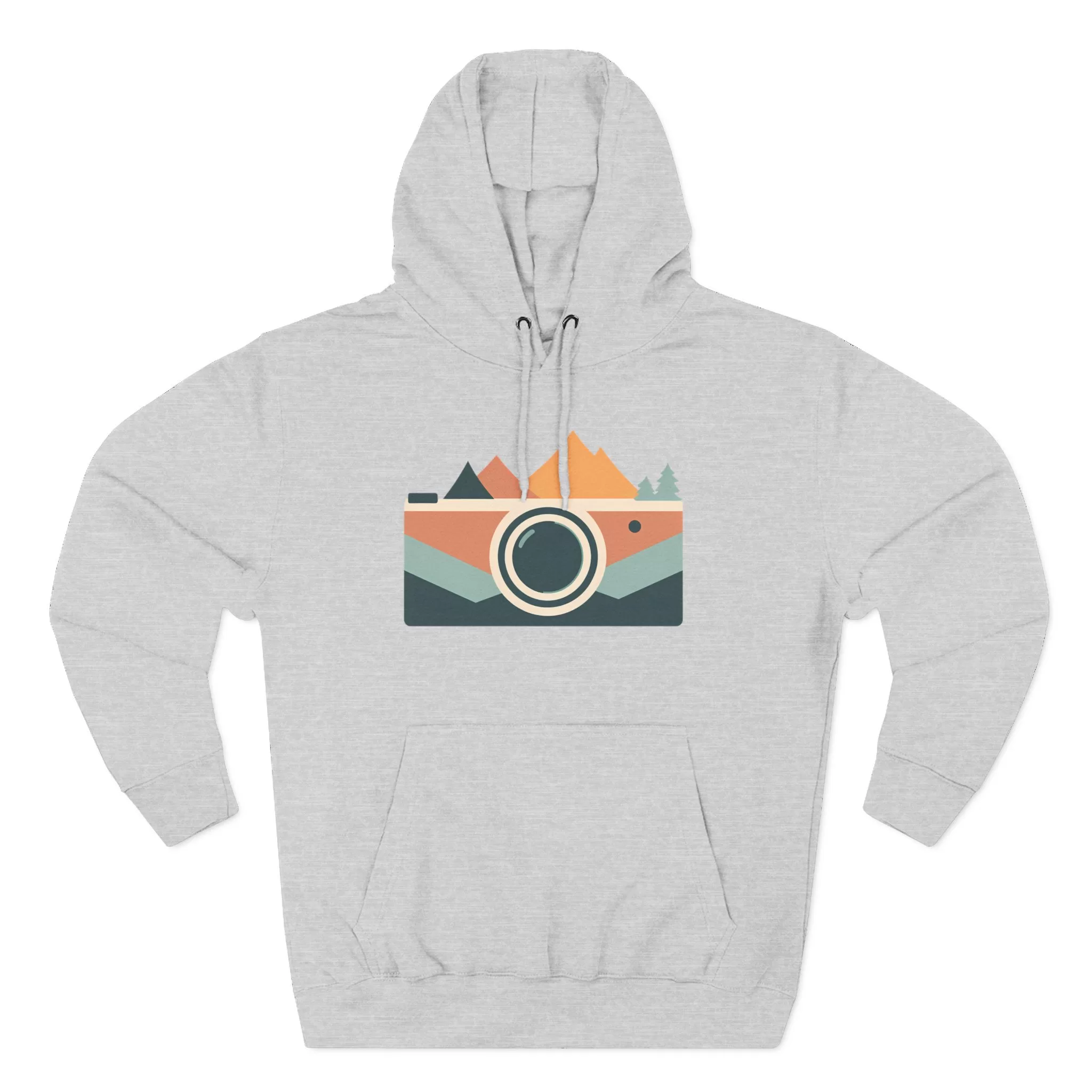 A cozy Three-Panel Fleece Hoodie featuring a design of mountains, camera, and forest, perfect for outdoor enthusiasts and nature lovers. This hoodie gives off a sense of adventure and exploration, making it ideal for camping trips and nature walks.